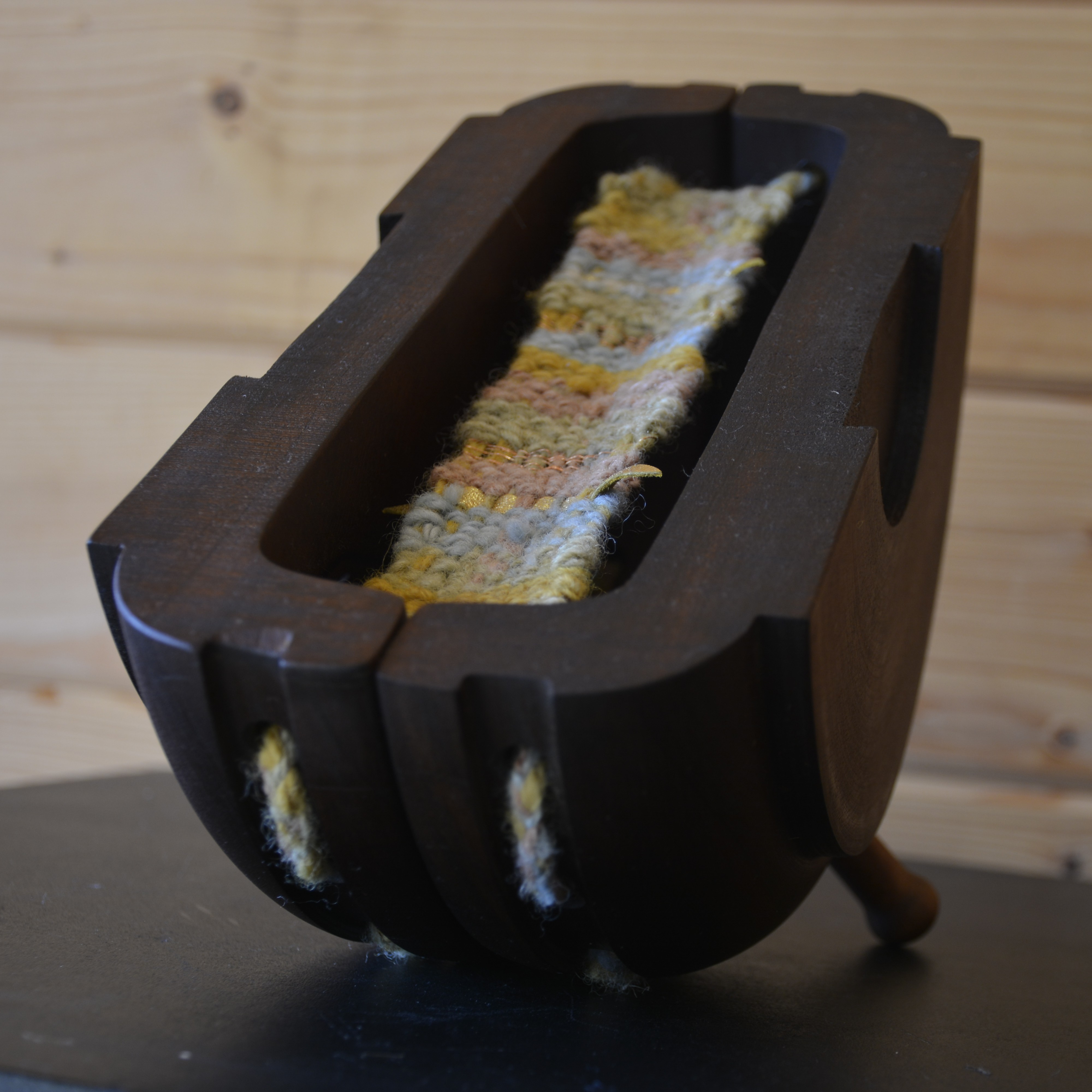 Iroko wood/ Hand spun, Naturally dyed wool/Copperwire/Gold Leather